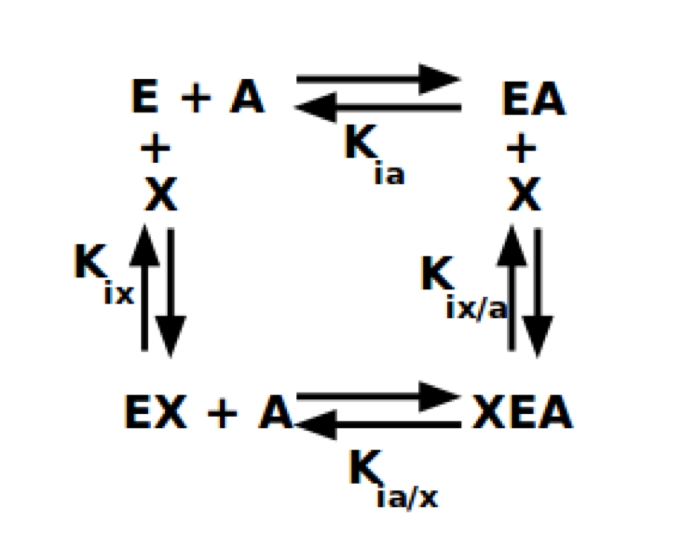 Several non-synonymous variants of R/L-PYK observed in PK deficiency patients fall in or near the allosteric effector binding sites. Therefore, modifications in allostery seem sufficient to cause disease. However, an experimental evaluation of allosteric regulation in a disease-related protein is dependent on the definition of that regulatory phenomenon. Even subtle differences in the definition of allostery influence experimental designs and interpretations. This challenge relies on defining allostery as an energetic energy cycle (Fenton, 2008; Reinhart, 2004) between substrate (A) and effector (X) binding to the enzyme (E). This energy cycle is represented in Reaction 1.
