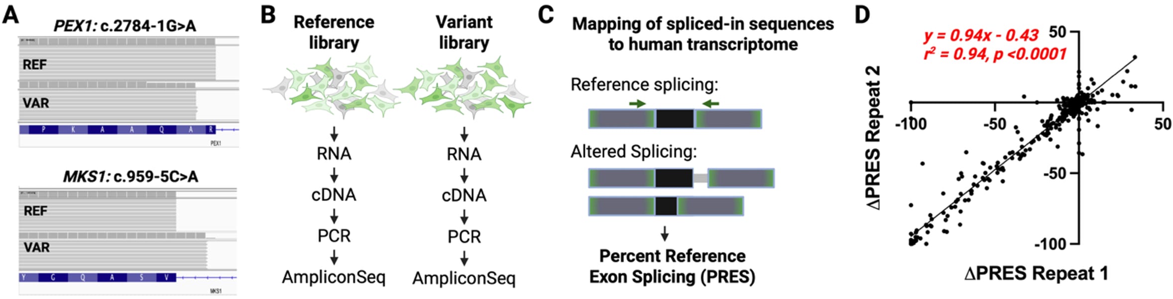 Figure 4. HTSA experiment 2 design and analysis. (A) Examples of two variants in two different genes leading to aberrant exon inclusion, resulting in exon truncation or partial intron inclusion. (B) Experimental design for the parallel reference and variant library experiments, where spliced-in sequences are analyzed by amplicon sequencing. (C) Analysis of the sequence data by mapping to the human transcriptome and categorizing reference or altered splicing for each oligo sequence (reference or variant), resulting in the calculation of the percent reference exon splicing (PRES) metric. (D). ∆PRES = PRESVar – PRESRef values from two independent experiments show high reproducibility.